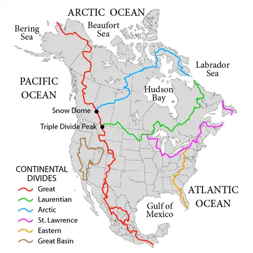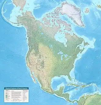 North America's only land connection to South America is in present-day Panama at the Darien Gap on the Colombia–Panama border, placing almost all of Panama within North America.[74][75][76] Alternatively, some geologists physiographically locate its southern limit at the Isthmus of Tehuantepec, Mexico, with Central America extending southeastward to South America from this point.[77] The Caribbean islands, or West Indies, are considered part of North America.[70] The continental coastline is long and irregular. The Gulf of Mexico is the largest body of water indenting the continent, followed by Hudson Bay. Others include the Gulf of Saint Lawrence and the Gulf of California.