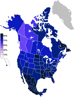 Europe's colonization in North America led to most North Americans speaking European languages, such as English, Spanish, and French, and the cultures of the region commonly reflect Western traditions. However, relatively small parts of North America in Canada, the United States, Mexico, and Central America have indigenous populations that continue adhering to their respective pre-European colonial cultural and linguistic traditions.