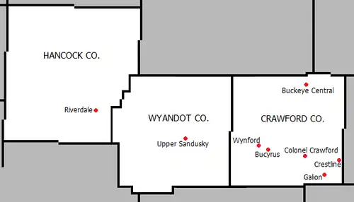| Buckeye Central | Bucks | New Washington | Scarlet, Gray | Public | 1962 | |