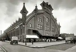 The Convention Hall was used extensively for various activities including a movie theater for silent movies, religious conventions, a roller skate rink, food shows, the Washington Auto Show[4] and dog shows organized by the Washington Kennel Club.[8] It was also used for High School graduations[9] and an armory for the DC National Guard.[10] On June 8-9, 1912, the Convention Hall was used for a banquet and a concert during the unveiling of the Columbus Fountain. The event was a major celebration in the city and gathered some of the most prominent individuals in the city. The building was one of the biggest venues at the time, allowing for large gatherings.[11]