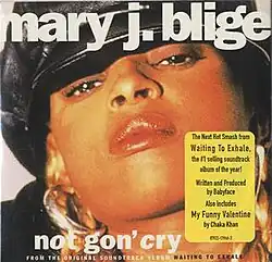 "Not Gon' Cry" is a song by American R&B singer Mary J. Blige, from the soundtrack to the film Waiting to Exhale; the song is also featured on Blige's third album, Share My World (1997). It was written and produced by Babyface and became a major hit for Blige in the United States, where it peaked at numbers one and two on the Billboard Hot R&B Singles and Hot 100 charts, respectively. The single sold 1,000,000 copies domestically and was certified platinum by the Recording Industry Association of America.