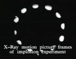Flash X-Ray images of the converging shock waves formed during a test of the high explosive lens system