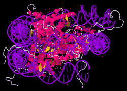 - ^ a b Luger K, Mäder AW, Richmond RK, Sargent DF, Richmond TJ (September 1997). "Crystal structure of the nucleosome core particle at 2.8 A resolution". Nature. 389 (6648): 251–260. Bibcode:1997Natur.389..251L. doi:10.1038/38444. PMID 9305837. S2CID 4328827.