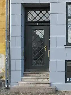 Magstræde 15 us also a four-storey building but just four bays wide. The building material is again brick. The simple front is plastered and painted in a pale grey colour. In the southernmost bay is a green-painted door and the cellar windows have green-painted shutters. The facade is finished by a simple, white-painted cornice. The pitched roof is clad in red tiles.[24]
