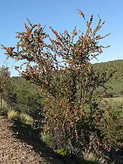 Nymania capensis is a species of plant known in English as "Chinese lantern" because of the shape of its bright, colourful fruit, and in Afrikaans as "klapper" (meaning "firecracker" because children sometimes pop the capsules for fun).[1] It is the only species in the genus Nymania. It is a spare, scrubby, woody shrub or small tree, typically ) 0.5–3 m tall. It is endemic to South Africa and some closely bordering territories, especially inland regions in central, northern and eastern parts. It grows mainly in Karooid regions, among the scrub of gorges, but also in open veld and river banks in the Great and Little Karoo, Namaqualand and Kalahari.[2] The leaves are alternate and fascicled. They are simple and more or less linear. The flowers are solitary, born on pedicels in axils. The corolla and calyx have four lobes each, with eight stamens inserted at the base of the disc, the filaments being connate at their base. The ovary is superior and sessile; it has four lobes and four locules, each containing two collateral ascending ovules. The stigma is simple and the style extends further than the stamens. The fruit is an inflated membranous capsule, 3–5 cm across, each locule forming a distinct lobe. The ripe seeds are hard and rounded, some 2–4 mm in diameter. A locule may contain less than two seeds, due to abortion.[3]