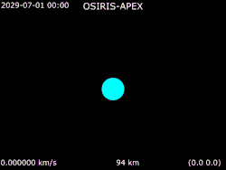 On 25 April 2022, NASA confirmed that the mission would be extended. After dropping off its sample to Earth on 24 September 2023, the mission became OSIRIS-APEX ('APophis EXplorer').[77] As the new name suggests, its next target will be the near-Earth asteroid (and potentially hazardous object) 99942 Apophis. Apophis will make an extremely close pass to the Earth on 13 April 2029, although there is no chance for an impact during this or any subsequent flybys in the near future. Observations of Apophis will commence on 8 April 2029, and a few days later, on 21 April, OSIRIS-APEX is planned to rendezvous with the asteroid.[90] OSIRIS-APEX will orbit Apophis for around 18 months in a regime similar to that at Bennu. The spacecraft will perform a maneuver, similar to sample collection at Bennu, by using its thrusters to disturb Apophis's surface, in order to expose and spectrally study the subsurface and the material beneath it.[16] However, the proposed FY2026 budget cuts funding for OSIRIS-APEX, and it is set to be shut down.[91]