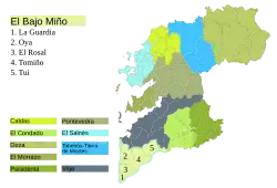 O Baixo Miño (English: Lower Miño, Spanish: Bajo Miño, Portuguese: Baixo Minho) is a comarca in the Galician province of Pontevedra. The area covers 315.1 km2, and the overall population of this comarca was 50,978 at the 2011 Census;[2] the latest official estimate (as at the start of 2018) was 49,646.[1] To the west of O Baixo Miño lies the Atlantic Ocean and to its southeast is the Minho River, which forms a natural boundary with Portugal.[3]