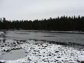 - 11.4 kilometres (7.1 mi) to the West, crossing the “Lac à l’Eau Jaune” (English: lake of Yellow Water) (length: 18.6 kilometres (11.6 mi); altitude: 365 metres (1,198 ft));