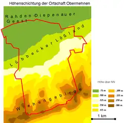 Obermehnen is a village in the German state of North Rhine-Westphalia in the county of Minden-Lübbecke. The village belongs administratively to the town of Lübbecke. Obermehnen has 1,360 inhabitants and an area of 9.6 km². At around 137 people per km² Obermehnen has the lowest density of all of Lübbeck's districts, not least because 4.3 km², i.e. 45%,[2] of the parish area consists of uninhabited hill forest on the Wiehen Hills. Obermehnen is thus the most wooded part of the borough of Lübbecke.