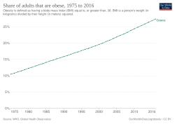 Greece's growing health concerns related to obesity are becoming an issue that was not evident in the past because of an increase in consumption of high fat, high calorie, fast foods and decreased levels of activity. Obesity brings on health concerns such as diabetes and cardiovascular disease. Greece is adopting a western style of eating and straying away from the active lifestyles they once possessed.[1]