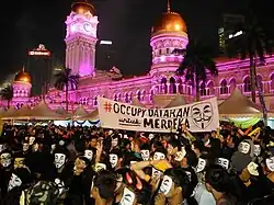 Occupy Dataran was an autonomous grassroots movement based in Kuala Lumpur,[1] that aims to create a platform to experiment participatory democracy based on the popular assembly model.[2] The Malaysian Insider reported that Occupy Dataran was an offshoot of Occupy Wall Street. The online news portal also reported that the Malaysian protesters were expressing solidarity with the New York protest movement as part of the 15 October 2011 global protests.[3] However, it is widely acknowledged that the first Occupy Dataran assembly was held on 30 July 2011,[4][5][6] seven weeks before Occupy Wall Street.
