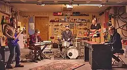The Battle of the Bands was held on February 12, 2005 at Cain's Ballroom. 47 bands participated and Euromart was selected to be among the seven finalists to perform.[4] Wantland, who was not at the lunch session where the name Euromart was coined, was unaware the band was his own when asked if it was.[3] Tulsa World specified Euromart had "a strong fan presence" at the event and noted that "Rector even managed to mix things up by dropping the guitar and jumping on the piano, an obvious crowd pleaser."[4] Euromart did not place; Xanadu, Three Godfathers, and Stoneface Norman were judged to be the top three, and Xanadu won both the grand prize and the People's Choice award.[3] In retrospect Rector could recall specifics about Xanadu's performance and looks on it fondly.[4]