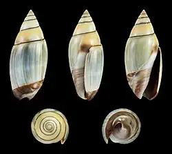 Olivella volutella is a species of small sea snail, marine gastropod mollusk in the subfamily Olivellinae, in the family Olividae, the olives. Species in the genus Olivella are commonly called dwarf olives.[2]