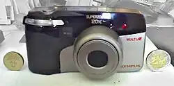 The Olympus Superzoom 120TC is a 35mm compact camera, most notable for being able to continuously shoot pictures at a rate of 4 frames per second. The 120 part of the model number represents the maximum telephoto focal length, the range being 35โ120mm.[1] The TC part indicates that it has a self-timer, and can be activated by an infra-red remote control. Another notable feature is that the zoom lens moves at 2 different speeds depending on how hard the button is depressed.[2]