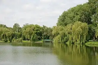 Under the leadership of Mikhail Tolstoy (Jr.), the construction of the so-called New Park in Onufriivka began. It is most probable that it was founded in 1884, as evidenced by the inscription "1884" in the nursery in the south of the park.[20] At the expense of Mikhail Mikhailovich, a zemstvo school was built in Onufriivka (there is a letter "T" on some bricks as a marking sign of the Tolstoy brick factory in Onufriivka), and in 1896 a zemstvo hospital was built in the village of Pavlysh, which is 7 km from Onufriivka.[21]