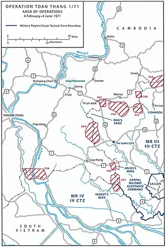 The goal of Operation Toan Thang 1/71 was to destroy PAVN and Khmer Rouge bases and to help the Cambodian forces reestablish control over the area north of Highway 7 up to the Mekong River town of Kratié.[1]: 47–9