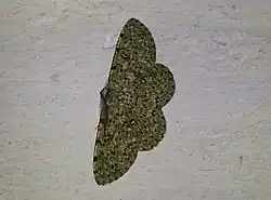 The wingspan of the adult is 36 mm. Its ground colour varies from grass green, grey green to yellowish green with black irrorations (speckles). Its abdomen has paired black dorsal specks. Forewings with black lines at waved antemedial and dentate medial, post-medial and submarginal areas. Hindwings also with black lines at medial and submarginal areas. Both wings with marginal series of black specks. Underside is with large spot at end of cell of each wing.[6] Host plants of the caterpillar include Diospyros and Casearia species.[7]