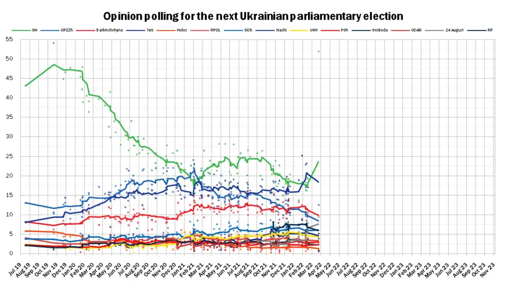 The chart below shows opinion polls conducted for the next Ukrainian parliamentary election until the start of the Russian invasion. The trend lines are local regressions (LOESS).