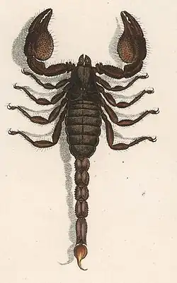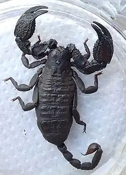 Opisthacanthus capensis is a Cape Province and Zimbabwean species of scorpion with robust chelae, dark brown to black in colour, turning green when under cover for some time. Opisthacanthus scorpions are arboreal and ground-dwelling, and found mainly in moist habitats in dense vegetation, pine plantations and forests, and hiding under bark and rocks.[2]