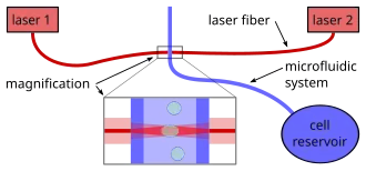 - A microfluidic system. Typically, a suspension of single cells is pumped through a capillary. When a cell is in the right position to be trapped by the lasers, the flow must be stopped and the lasers turned on.
