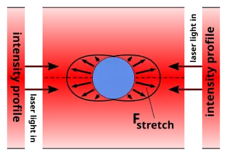 - The Gaussian beams used in optical stretchers are – in contrast to optical tweezers – weakly divergent. The momentum carried by the photons thus basically points in the direction of light propagation. After leaving the object, the magnitude of momentum is the same but most photons have changed in direction of propagation, such that on the whole they carry less momentum in the forward direction. This missing momentum is transferred to the object. This part is called the scattering force, because it arises from scattering the light in all directions. Because the scattering force always pushes objects in the direction of beam propagation, one needs two counterpropagating beams whose scattering forces cancel mutually in order to stably trap cells.