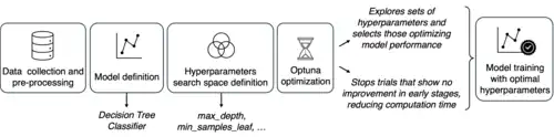 Optuna is designed to optimize the model hyperparameters, by searching large spaces and discarding combinations that show no significant improvements in the model. Moreover, it can parallelize the hyperparameter search over multiple threads or processes. Optuna works with a high degree of modularity, allowing the definition of different configurations for searching hyperparameters. It is possible to choose which hyperparameters to optimize and how to optimize them. Additionally, it permits parameter customization at runtime, meaning that the values to explore for the hyperparameters (i.e., the search space) can be defined while writing the code, rather than being defined in advance.[1]