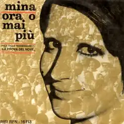 "Ora o mai più" (English: "Now or Never") is a song recorded by Italian singer Mina in 1965. Its authors were Gianni Ferrio and Antonio Amurri. The song also became the final theme of the television program La prova del nove, in two episodes of which Mina took part in the same year. The song was released as a single in October 1965, with "Addio" on the B-side.[1] The single reached number twelve on the Italian chart, spending a total of twelve weeks there.[2] In addition, Mina recorded Spanish versions of both songs, titled "Ahora o jamas" and "Adios", respectively.[3]