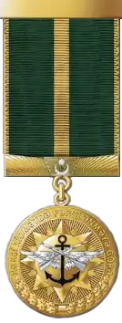 | The 90th Anniversary of the Armed Forces of Azerbaijan 1918-2008 Medal | Established in accordance with the decree of the President of Azerbaijan Ilham Aliyev on May 16, 2008; eligible personnel include warrant officers and ensigns who succeeded in combat training while serving in the armed forces until June 26, 2008, as well as retired officers who actively participated in the formation and strengthening of the Armed Forces of the Republic of Azerbaijan.[11] The medal is worn on the left chest, and in the presence of other orders and medals, it is attached after the "10th Anniversary of the Armed Forces of the Republic of Azerbaijan (1991–2001)" Medal. A round shaped medal that is made of bronze with a 35 mm diameter which is plated with gold ornaments.[11][12] |