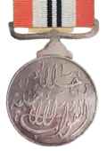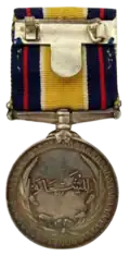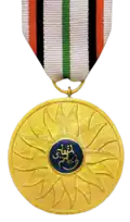 | Medal of Independence | | Granted to all officers, Military College students, non-commissioned officers, and soldiers serving in the People's Armed Forces as of the day of independence.[55] It consists of a medallion made of mother-of-pearl, plated with shiny silver. Its diameter is 36 mm and its thickness is 2.8 mm. It is worn on the left side of the chest. The front side of the Medal consists of the flag of independence raised and the flags of the Condominium on both sides are lowered, and the sun's radiance on the horizon appears in the form of a semicircle behind the flags. On the reverse side of the medallion is written the phrase "Independence of Sudan".[5] |