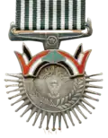 | Star of Military Accomplishment | | Given to military members who support the growth and development of the military.[35] The star is made of silver and has three tandem surfaces. The first part is a star with four branches, the distance between the two large branches is 85 millimetres, and the two small ones are 70 millimetres, made of silver plated with gold. The second part is a circular disc of silver with a diameter of 38 millimetres. In the upper part are 25 heads of the Venetian sonke, a symbol of the 25 May revolution, and then the phrase “The Star of Military Achievement” in the lower part. The third part is the emblem of the Republic in oxidised silver inside a circle with a diameter of 20 mm. The medal hangs from a ribbon of shiny, wavy silk, 32 mm wide, consisting of four colours. Two stripes of red on both sides of the ribbon, each 7.5 mm wide, followed by two white stripes, each 4 mm wide, then green in the middle, 5 mm wide (and two black stripes on the ends, 2 mm wide). The medal is worn on the chest on the left side. A miniature silver medal accompanies this medal. It bears the same specifications as the larger medal, reduced to one-third in dimensions, except for the width of the ribbon, which is reduced to half, and is worn over the diaries for the military.[5] |