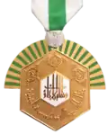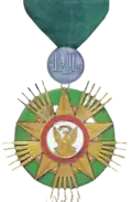| Order of Production | | Given to Sudanese and foreigners who contribute to raising production, whether in the agricultural or industrial sectors or any other fields.[29] The order has gold,[30] silver[31] and bronze.[32] It consists of a silver medal plated with gold water in the case of the silver medal and bronze in the case of the bronze medal. It includes three synonymous surfaces. The first is a circle with a diameter of 30 mm. At the bottom, there is a gear symbolizing industry. On one side of the circle is a branch of the cotton tree, and on the other side is a design symbolizing energy. And technological sciences, in the middle of which is a curved shape that symbolizes openness to agricultural production with its multiplicity of varieties, and bears the word 'production' in a circular shape. The second surface is a star with seven branches sloping on the surface and the sides, and the third is a star of six branches with a flat top and sloping ends, and it is worn on the chest from the left side 22 millimetres. The green colour is mediated by one white line in the case of the Golden Medal, two white lines in the case of the Silver Medal, and three white lines in the case of the Bronze Medal.[5] |