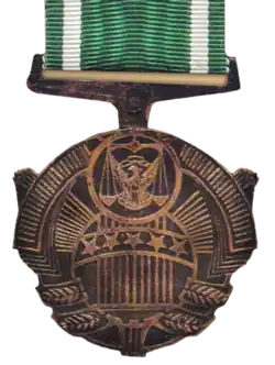 | Medal of Victory | | Awarded to members of the armed forces, police, and prisons who excelled in protecting the coup.[59] The medal consists of two synonymous surfaces of copper coated with oxidised silver: the lower surface consists of fourteen in a circle of 50 millimetres in diameter bearing on the back the phrase 'Victory 1971' in the middle of a circle of 32 millimetres in diameter and on both sides of it are olive branches. The upper surface is a circle with a diameter of 32 millimetres, on which is the picture of the President, Commander Jaafar Muhammad Nimeiri, receiving the torch of victory from the masses of the people on Victory Day. The decoration hangs from a ribbon of shiny silk, 32 millimetres wide. It consists of two black lines on both sides of the ribbon, each 3 millimetres wide. Each line is directly followed by a green line of the same colour as the flag of Sudan. Its width is 10 cm. In the middle is a white line whose width is 6 millimetres.[5] |