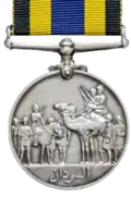 | Medal of Evacuation | | Granted to all officers, students, and soldiers who served during the withdrawal of foreign forces from Sudan.[54] It consists of a copper nacre plated with shiny silver, its diameter is 36 mm and its thickness is 2.8 mm. It is worn on the chest from the left side. The front side of the medallion consists of a flying camel inside a disc placed between the flags of the dual government on both sides, and the sun shining on the distant horizon in the form of a semi-circle from the top of the medallion. On the reverse side of the medallion is written the phrase "The Evacuation of Foreign Forces." The medallion hangs from a white ribbon of shiny silk, in the middle of which is the flag of the Sudan Defense Force, with two borders of red color on the edges.[5] |