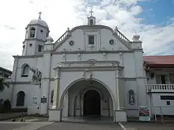 The church façade is of barn-style Baroque, a style that has been described as typically found in most Spanish-era churches in the Philippines. It features side pillars capped by urn-like finials, pilasters that divide the façade into five segments and cornices that divide the expanse of the wall into two levels. The pediment is semi-arched and ends into two small volutes before tapering down to the sides. It is adorned by a framed saint's niche flanked by two hexagonal windows. A concrete porte cochere has been added later into the structure. To the left of the church rises the four-level, slender belfry. The two uppermost levels are octagonal and are pierced with rectangular, circular and semicircular arched campanile windows.[1]