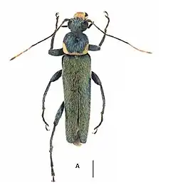 Adults reach a length of about 7.7 mm. The antennae are bicolored, with the apical four segments yellow. The pronotum is basally yellow and there is a yellow region along the posterior margin and the basal half of the lateral margins. The elytra are metallic green with golden recumbent setae.