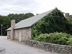 The Otis Angell Gristmill stands in north-central North Providence, on the south side of Governor John Notte Memorial Park, one of the town's few public parks. It is a 1-1/2 story masonry structure, built out of uncoursed fieldstone with rough-cut granite corner quoining. It is covered by a gabled roof with a wooden cornice. It has two chimneys, one of brick piercing the roof, and one exterior stone chimney. The main facade faces northeast, and is three bays wide, with a center entrance set in a brick-framed opening with an segmental arch at the top. The flanking window bays have been infilled with stone. There is a service entrance in the gable, historically used for loading materials into the attic level; it is now accessible by an outside staircase. Just to the north of the mill, across the Governor Notte Parkway, is the mill pond. The parkway crosses along the approximate route of what was formerly the mill's main spillway, and is now a culvert over the West River.[2]