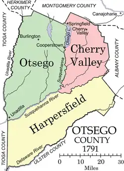 Otsego and Cherry Valley together roughly covered the area of modern Otsego County, while Harpersfield covered the area south of the current county as far as the Delaware River.