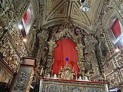 The carving of the chancel, considered the masterpiece of the genre in the period,[8] was made by Francisco Xavier de Brito and executed from 1746 to 1751, that is, until his death.[3] The work includes the Virgin of the Pillar enthroned in a place traditionally reserved for the Eucharist and the coronation is surrounded by several angels and cherubs of different sizes. Solomonic columns and corbelled pilasters called quartelões were adopted as supporting elements,[8] but they also exalt strength and manliness.[5]
