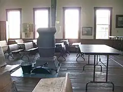 The interior of the schoolhouse is furnished with pieces from the 1870s, including the iron worked legs on the oak-top school desks and the large potbelly stove in the center of the room. The coal bucket and scoop are located close to the stove. The teachers desk is located on a dais with a large blackboard behind the teachers desk.