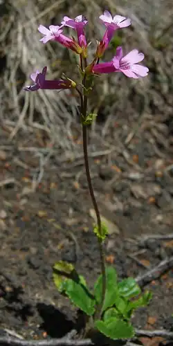 Ourisia alpina is a species of flowering plant in the family Plantaginaceae that is endemic to mountainous habitats of the Andes of southern Chile and Argentina. Eduard Poeppig and Stephan Endlicher described O. alpina in 1835. Plants of this species of South American foxglove are perennial, rosette herbs mostly hairless, crenate leaves. There can be up to 20 flowers on a long, erect raceme, and each flower has a regular calyx, and a long, bilabiate, tubular-funnelform, light to dark pink or purple corolla with included stamens. The calyx and corolla are usually hairless or with some glandular hairs on the outside.