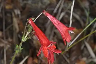 The two subspecies can be distinguished by their leaf edges, leaf hairs, and pedicel hairs.[5] O. coccinea subsp. coccinea has crenate but unlobed leaves that are hairy on the upper surface, and pedicels that are densely hairy with short to long glandular hairs (0.1–0.7 mm long). By contrast, O. coccinea subsp. elegans has crenate, lobed leaves hairs that are hairless on the upper surface, and pedicels that are sparsely hairy with tiny, subsessile glandular hairs (<0.1 mm).[5]