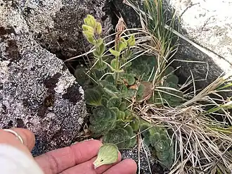 O. confertifolia can be distinguished from O. spathulata by its rosette habit (vs. leaves found along the stem), leaves with a silky appearance on the upper side (vs. densely glandular-hairy with a velvety appearance on the upper side, and usually shorter inflorescences (< 9 cm long vs. > 10 cm long).[4]