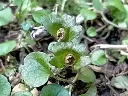 Ourisia modesta is unique among all other New Zealand mountain foxglove species in its very small size, mostly hairless aspect, opposite, and very broadly ovate to circular leaves that are widely separated along a creeping stem.[5] Furthermore, its flowers are solitary in each node, and inflorescences only have one or two flowering nodes.[5] The flowers have irregular calyces and irregular corollas that are very small (less than 9 mm long). Inside each corolla is one line of hairs plus a ring of hairs near the corolla tube opening.[5]