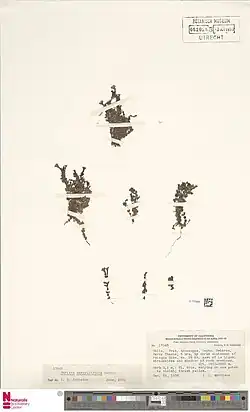 The type material was collected by Claudio Gay in the Andes mountains in Chile in February 1843. The lectotype was designated by Heidi Meudt and is housed at Herbarium at the Conservatory and Botanical Garden of the City of Geneva (Herbarium G-DC).[4] Ourisia melospermoides Phil. was described in 1872 by Rudolfo Amando Philippi[2] and is a synonym of O. serpyllifolia.[4][5] The lectotype of O. melospermoides was designated by Ricardo Rossow,[6] was collected in the mountains near Tiltil, Chile in January 1861 by Philippi,[2] and is housed at the Herbarium W at the Natural History Museum, Vienna.[4]