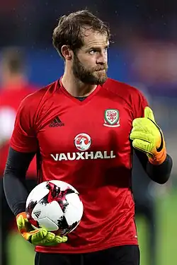 In February 2009, Williams earned his first call up to the senior Wales squad for the match with Poland in Portugal and was called up a second time the following month for the qualifiers with Finland and Germany.[79] He remained a regular back-up goalkeeper in the following years, including in their successful UEFA Euro 2016 qualifying campaign.[80][81][53][82] He finally made his debut on 13 November 2015 in a friendly against the Netherlands at Cardiff City Stadium, replacing Wayne Hennessey with 16 minutes to play and the score at 2–2, and conceded the winning goal from Arjen Robben.[83] In 2016, he was named in Wales' 23-man squad for UEFA Euro 2016.[84]