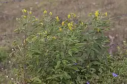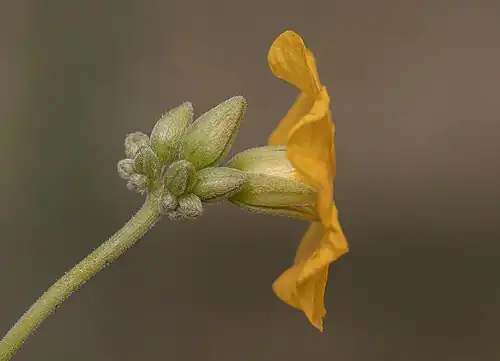 Oxalis psoraleoides is a hairy shrub up to 2 m tall and woody stems up to 1 cm in diameter. Leaves have three leaflets, with the center leaflet larger than the other two, and a long petiole up to 11 cm). The leaf blade is obovate or oblong, 1.5–6 cm long by 1–4 cm wide, and hairy on both sides. The inflorescence is a cyme with up to 50 actinomorphic (regular) flowers with five yellow petals, each up to 1.5 cm long. The fruit is a hairy subglobose capsule with one seed.[6]