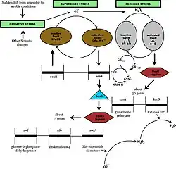 2. ^ a b c Farr, SB; Kogoma, T (1991). "Oxidative stress responses in Escherichia coli and Salmonella typhimurium". Microbiol Rev. 55 (4): 561–85. doi:10.1128/mr.55.4.561-585.1991. PMC 372838. PMID 1779927.