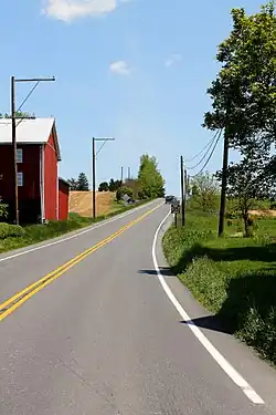 PA 35 begins at an intersection with US 522 near the borough of Shade Gap in Dublin Township, Huntingdon County, heading northeast on a two-lane undivided road. Soon after beginning, the route intersects PA 641 as it runs through rural residential areas. From here, the road heads into a mix of farmland and woodland with some homes, crossing into Tell Township. Here, PA 35 becomes Shade Valley Road and runs through more agricultural areas in a valley. The route continues through Richvale and runs through more farmland along with occasional woods and residences.[2][3]