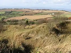 There is evidence of settlement in the area as long ago as the Iron Age. This can be seen in Kimsbury hill fort, a defensive earthwork on nearby Painswick Beacon, which has wide views across the Severn Vale. A Roman villa was built just to the north of the present village,[2] dated by Welbore St Clair Baddeley to the late second century.[3] The local monastery, Prinknash Abbey, was established in the 11th century. Painswick itself first appears in historical records in the Domesday Book of 1086, as Wiche, 'dairy-farm'. It continues to appear by this name into the 13th century. The form Painswik first appears in 1237, but must originate in the name of an earlier lord of the manor, Pain Fitzjohn (d. 1137). Pain was a common Anglo-Norman name (itself originating in paiën, Latin paganus, 'heathen').[4]