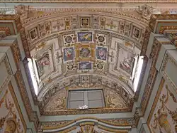 The interior decoration reflects the two phases of construction: in particular, the two vestibules on the ground and main floors, completely covered in late Renaissance decoration, have survived intact. Here the inspiration to Roman models and in particular Raphaelesque ones is evident on the part of Castello, author of the design and the frescoes enclosed between the stuccoes and grottesche. On the ground floor, delicately modulated white stucco frames run between fanciful, minute grotesque decorations and larger frescoes depicting full-length Olympian deities, while the central octagons depict Juno and Leda. On the side walls and on the Vault of the vestibule of the main floor, which is brighter, the colours of the decorations become brighter. They too are entirely covered, thanks to Bergamasco's intervention, with stuccos and grotesques and frescoed panels representing Apollo Citaredo with the Muses and Musician figures. Here too the unity of the architectural and decorative project is evident.[3]